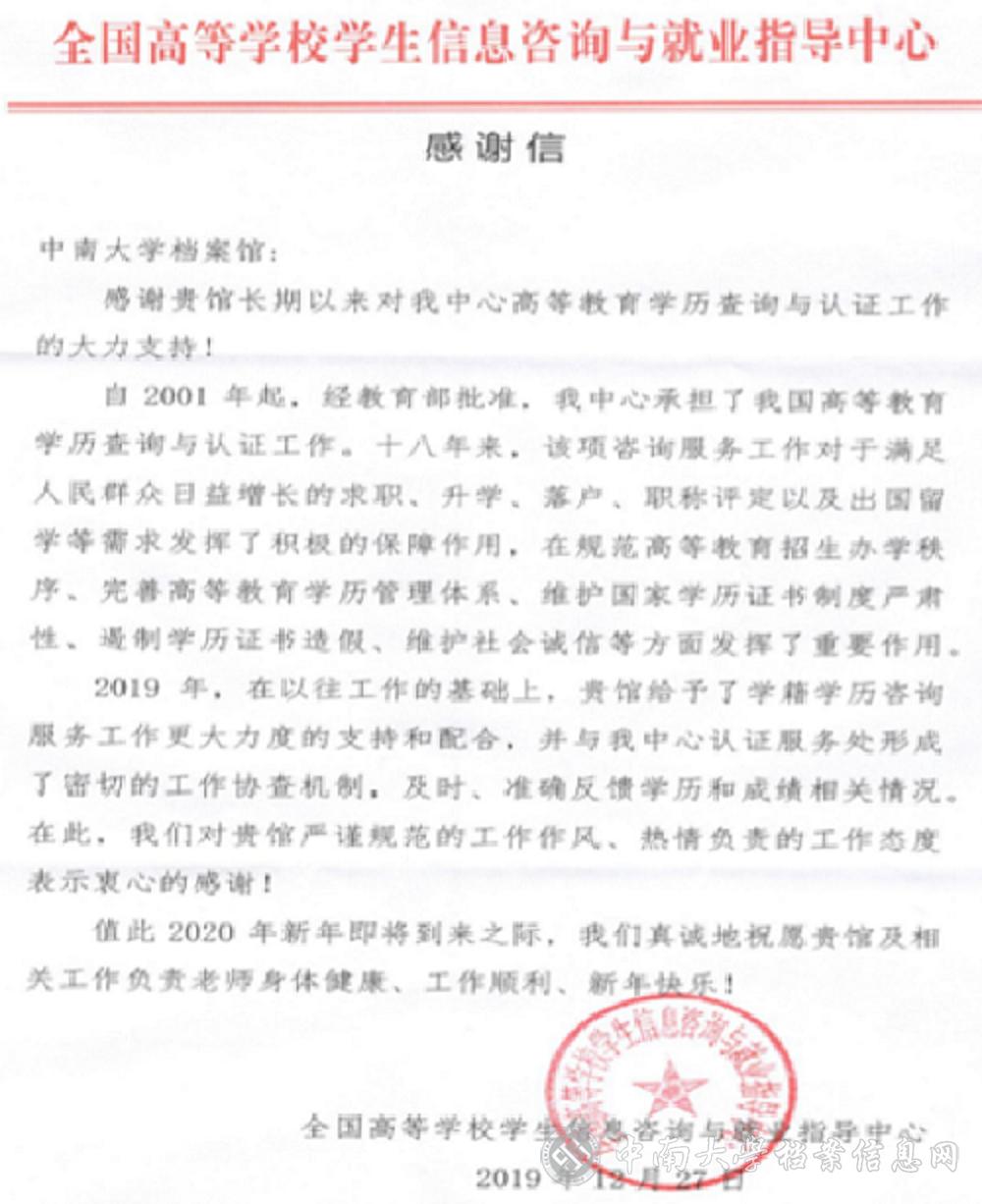 近日,档案馆收到全国高等学校学生信息咨询与就业指导中心发来的感谢信,感谢我馆长期以来对高等教育学历查询与认证工作的大力支持,充分肯定我馆学历和成绩相关工作协查机制,高度赞扬我馆工作作风严谨规范、工作态度热情负责。