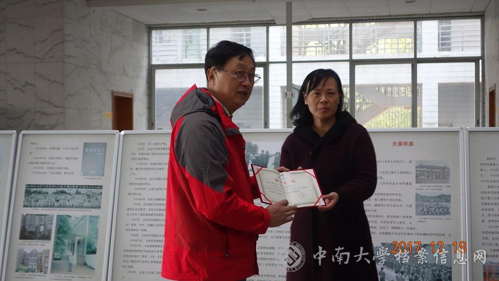 朱学红副校长代表学校在讲话中强调,档案馆、粉冶院举行纪念黄培云院士诞辰100周年捐赠档案展览,展出档案包含黄院士生前从事教学科研的手稿、工作笔记40册和有关粉末冶金专业的大量教材讲义、教学日历、各类证书聘书、评阅修改的研究论文和有关文件等,共计2282件、61094页。这些档案涉及面广、内容丰富、极为珍贵,是黄院士专注教学科研、人才培养等工作的生动体现,见证了黄院士为粉末冶金学科发展和学校建设发展孜孜不倦、开拓创新、默默奉献的高尚品格和非凡的人格魅力,对研究中国粉末冶金发展史、中南矿冶学院建校史和黄院士教学科研人生、学习黄院士的学术贡献和奉献精神等都具有重大现实意义和深远历史意义,是黄院士留给师生的一笔宝贵财富,也是支撑学校持续发展的精神动力。衷心感谢黄院士家属赵新那教授、黄家林教授等家人的无偿捐赠,真诚希望有更多的教师及家属参与到学校档案史料的征集中,将反映先辈们与学校改革发展历程和文化积淀的有关档案资料捐赠出来,进一步丰富、优化学校档案史料,让先辈们的风范更直接展现在师生面前,讲好中南故事,让中南精神薪火相传,为推进“双一流”建设提供更多动力。