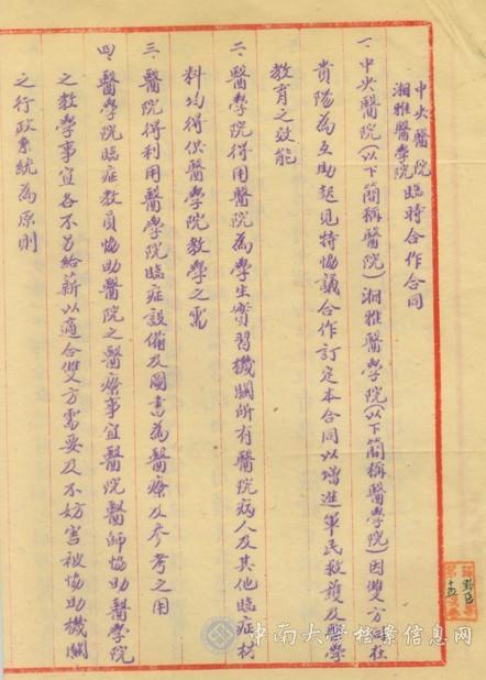周坚大校一行这次来访,为taptap官方网站赠送了两院在筑渝两地合作办医办学的数份历史档案。如:中央医院院长沈克非,湘雅医学院院长张孝骞1939年1月共同签署的合作协议;沈院长为筹办重庆中央医院,拜托张孝骞院长参与贵阳中央医院管理的信件等。在周大校带来的院史样稿中,荣登该院院史的湘雅籍校友有13位:呼吸病专家、医学教育家吴绍青(第1班毕业),外科学家、医学教育家沈克非,内科学专家杨济时(曾任湘雅的教务长、训育主任),医政管理及寄生虫病学专家姚克方(第4班毕业),儿科学家、医学教育家钟世藩(贵阳时曾任湘雅的教授),医学放射学专家黎光煦(第11班毕业),耳鼻咽喉科专家肖轼之(第12班毕业),传染病学专家徐采(第14班毕业),泌尿科学专家陈仁亨(第13班毕业),黄永乐(第14班毕业),热带病学专家陈子达(第14班毕业),输血专家肖星甫(第18班毕业),妇产科专家陈解民(第20班毕业)等。