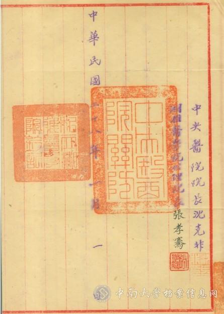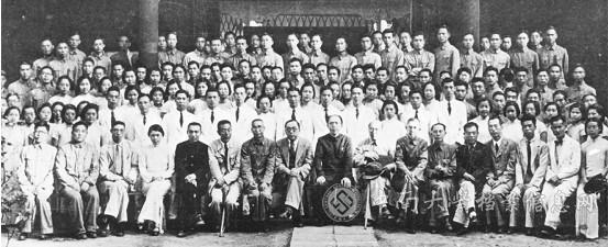 1940年8月湘雅医学院由私立改国立时师生在贵阳中央医院合影。前排中为院长张孝骞,右为沈克非。 |