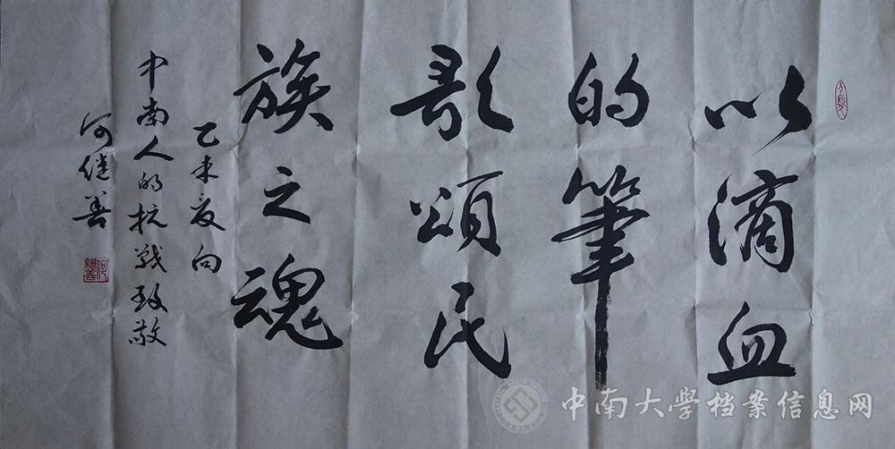 两个专题展览配合宣传册的发放,分别在新校区、南校区、校本部、湘雅校区和铁道校区巡回展出,让全校师生近距离感受档案文化,实现档案与师生的零距离接触,促进了师生对档案工作的了解,在全校师生中引起了良好的反响,何继善院士特为展览题字“以滴血的笔歌颂民族之魂”。