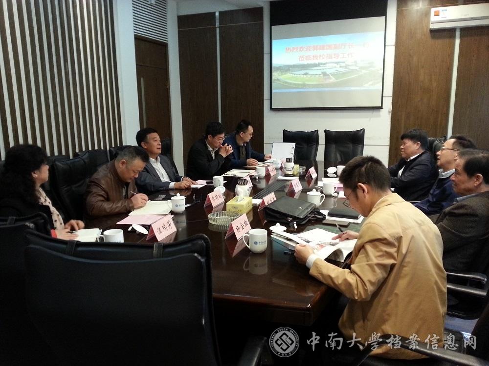2017年11月7日上午,湖南省教育厅副巡视员郭建国、省高校工委原副书记、湖南省教育人物志编纂委员会副主任胡学军、省高校工委党校原常务副校长杨志红、厅办公室副调研员杨金红一行4人来校指导人物志编纂工作,学校副校长黄健陵、学校办公室主任付刚华、档案馆馆长乔硕功等有关人员参加会议,付刚华主任主持会议。