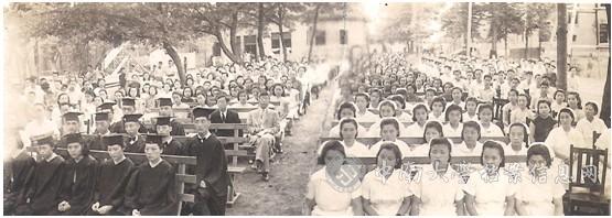 | 1947年夏初国立湘雅医学院第21班、私立湘雅高级护士职业学校第38班等全体学生同堂在复员重建后的湘雅校园开会。 |
